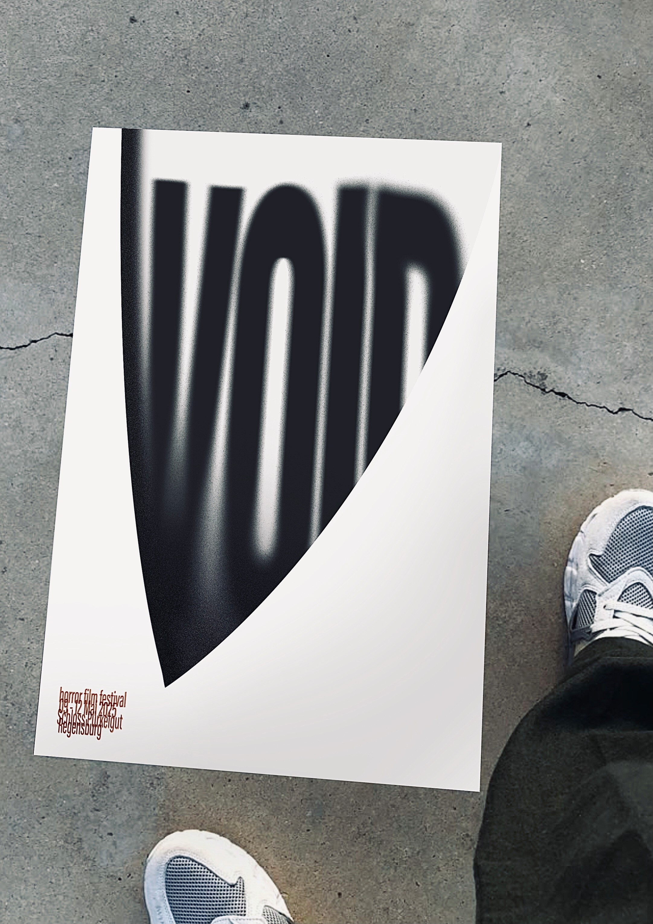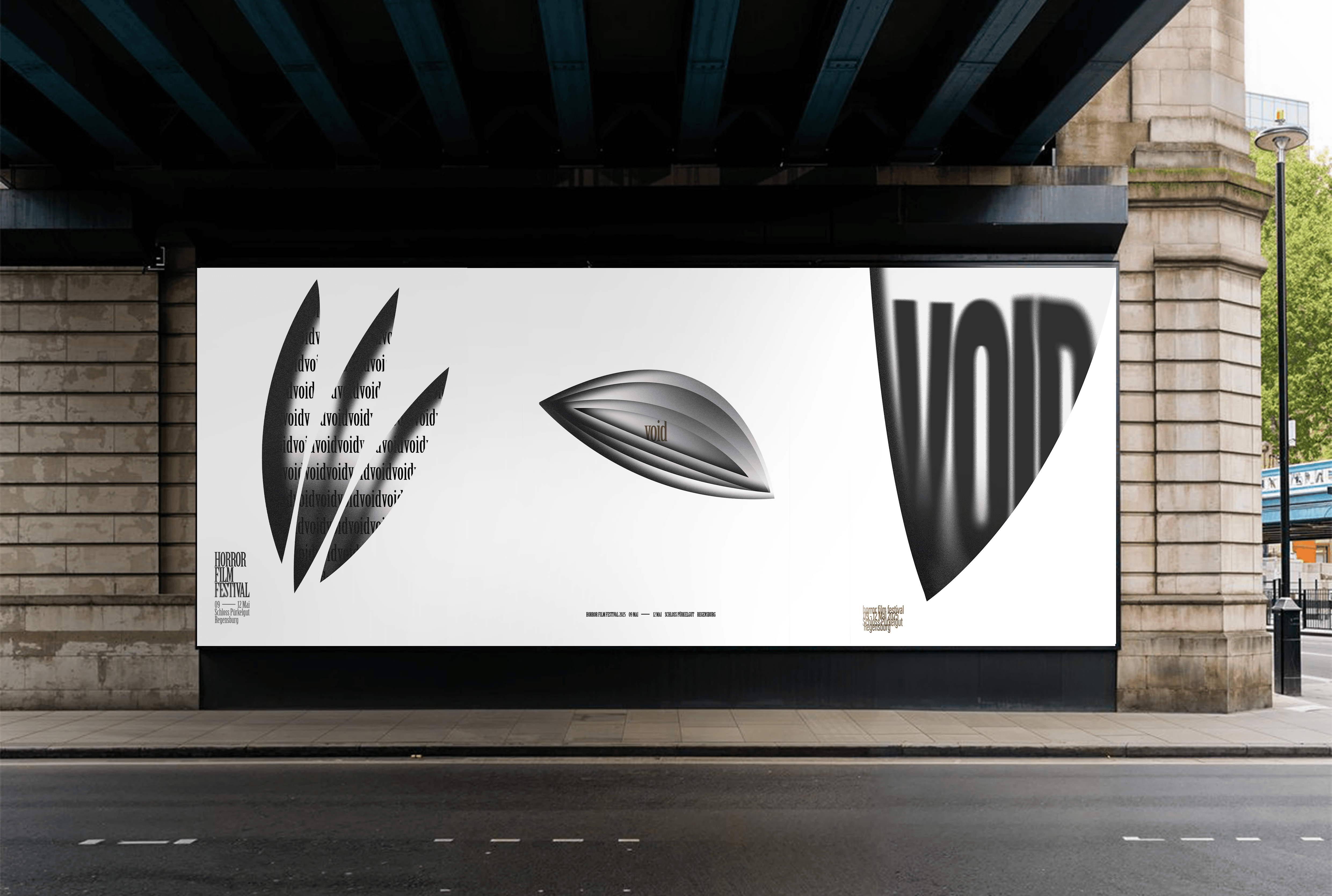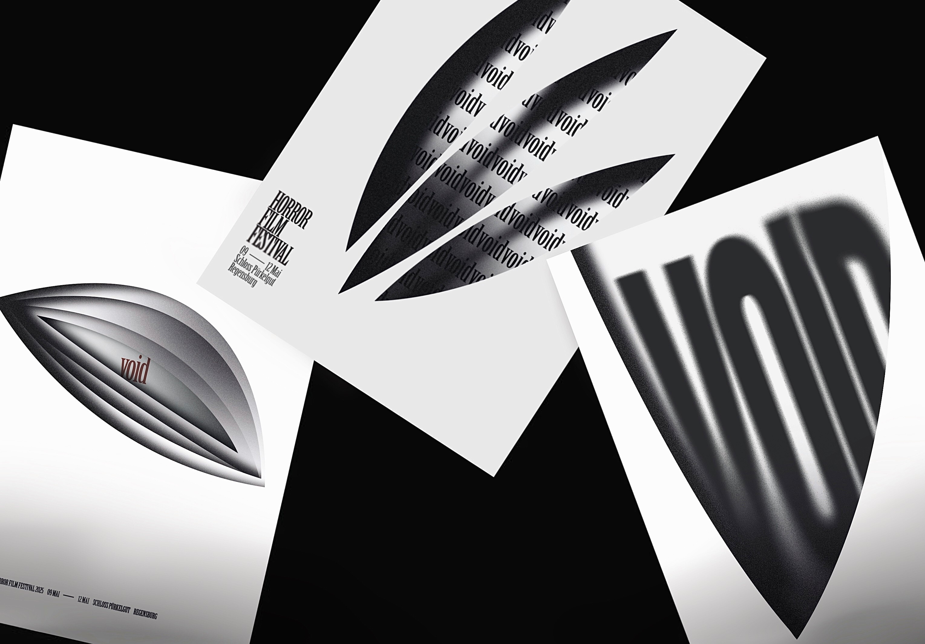 The festival theme—"VOID," meaning emptiness—set the tone for the content: It's about the uncanny in the invisible, the horror in silence, and the unknown in the space between. The posters were intended to raise questions rather than provide answers. White space was used as an active element to leave room for speculation and interpretation. I deliberately worked with associations with injuries, wounds, or eye shapes—design cuts that not only create tension but also suggest narrative depth.