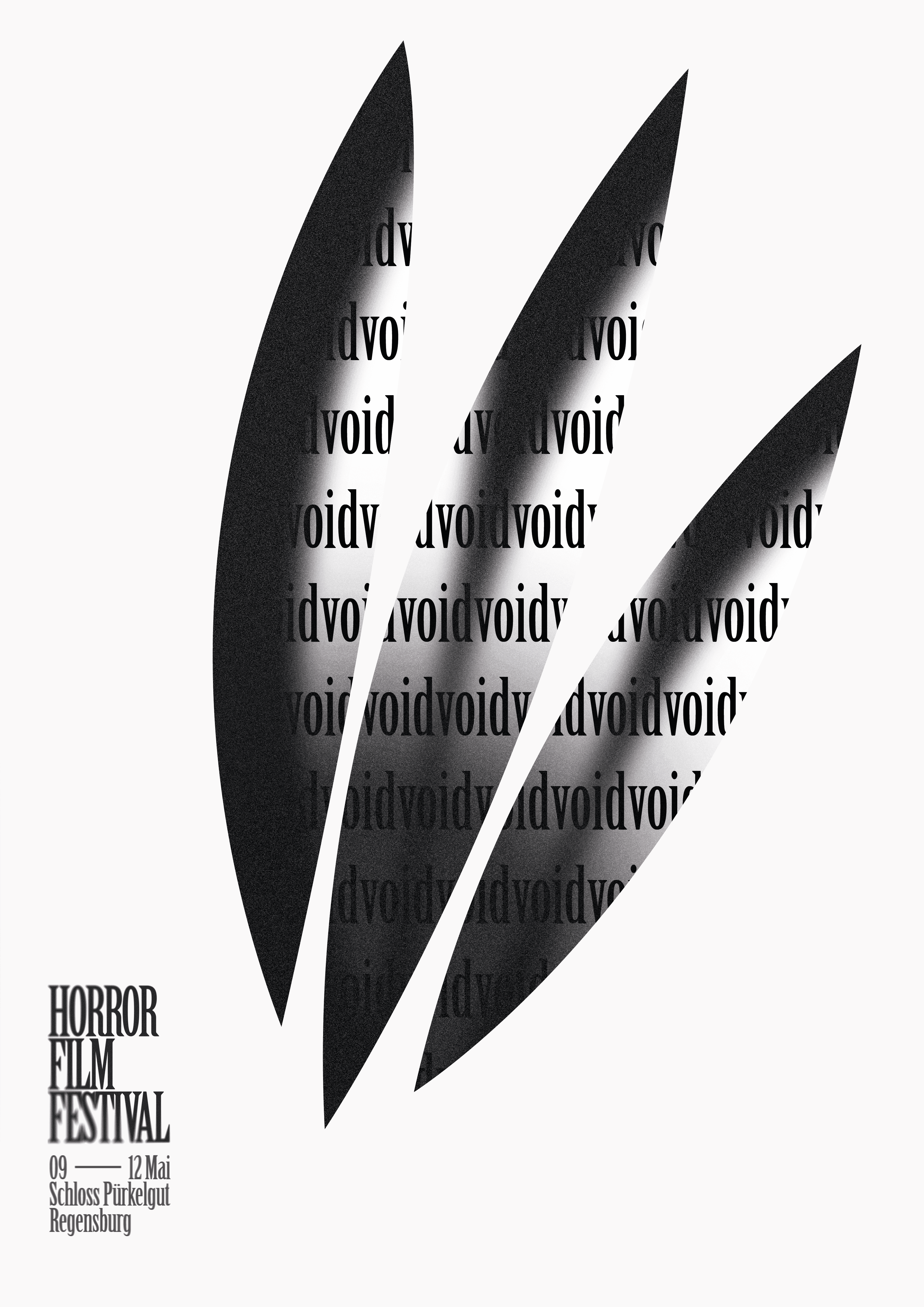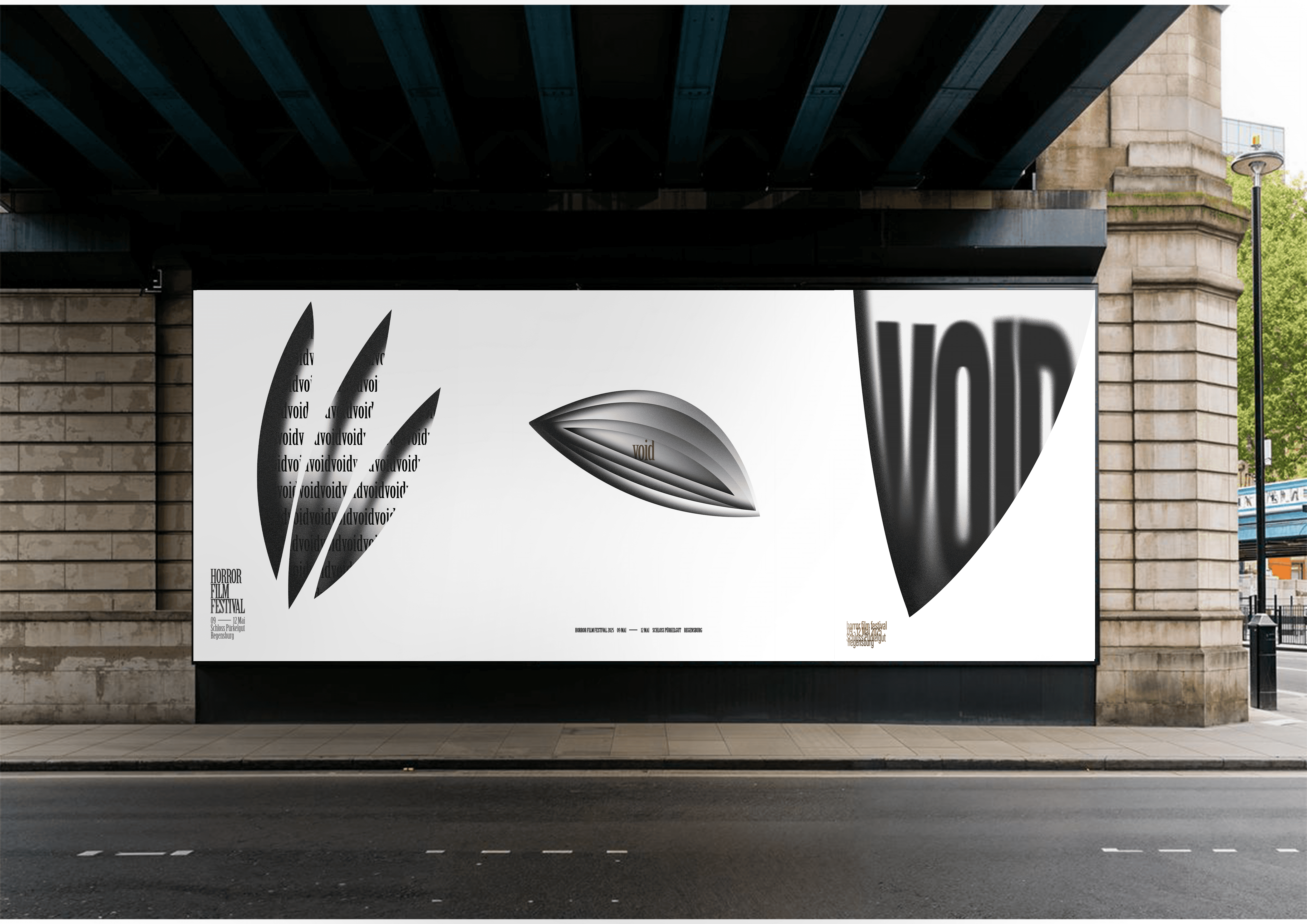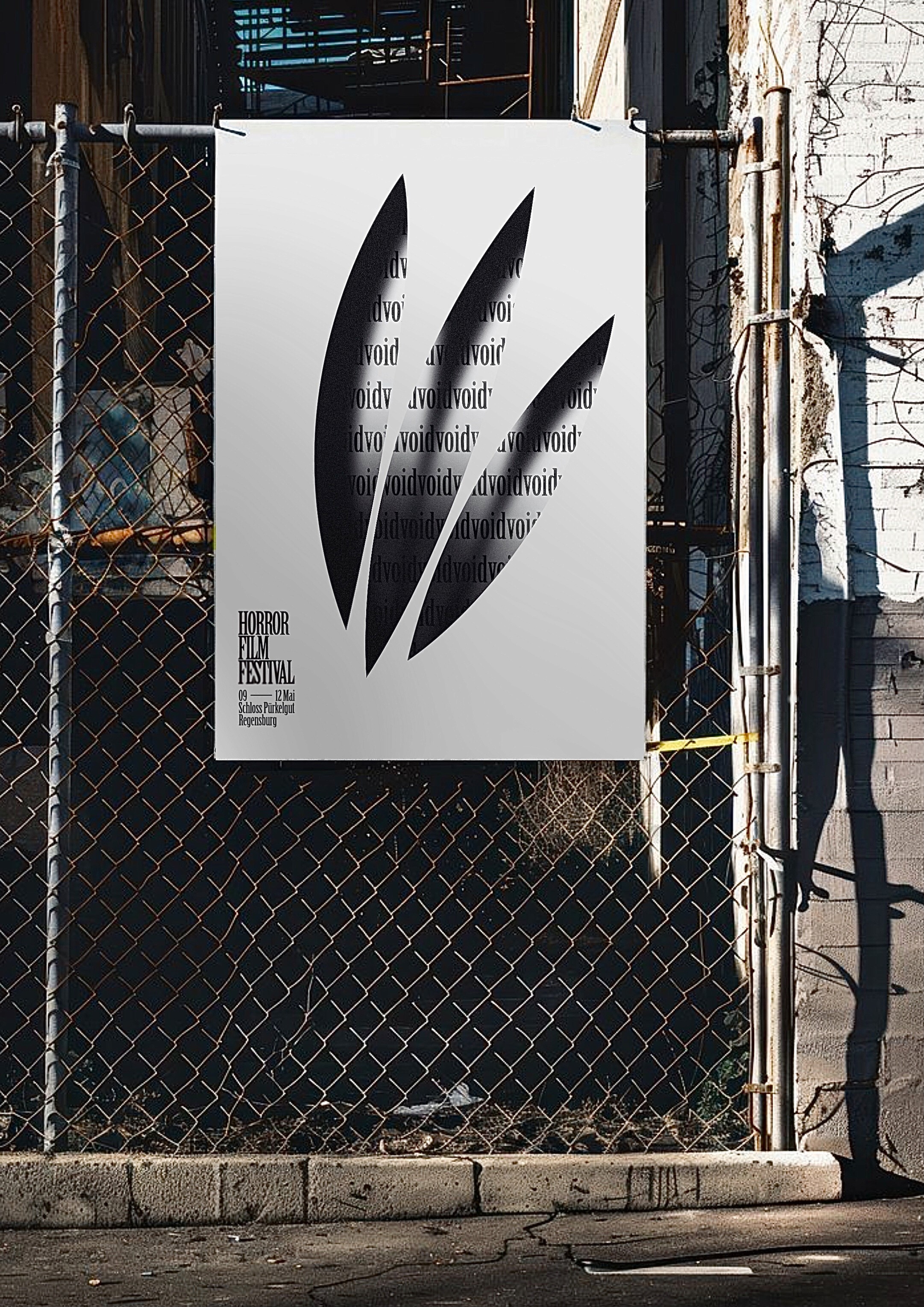 The festival theme—"VOID," meaning emptiness—set the tone for the content: It's about the uncanny in the invisible, the horror in silence, and the unknown in the space between. The posters were intended to raise questions rather than provide answers. White space was used as an active element to leave room for speculation and interpretation. I deliberately worked with associations with injuries, wounds, or eye shapes—design cuts that not only create tension but also suggest narrative depth.